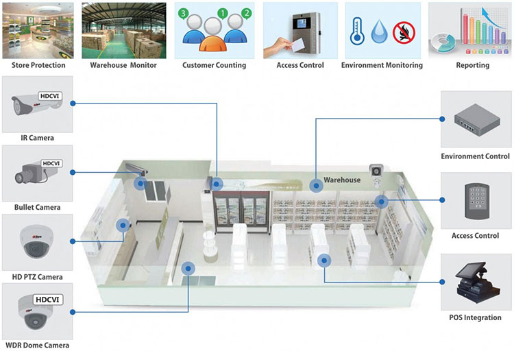 Counter – POS integration between IP camera and POS machine with the main purpose to reduce counter fraud and losses. Actual event during the bar code scan of each sales item will be overlaid on the CCTV recording footage to deter counter staffs from fake scanning an item during checkout. Sales data linked between the POS machine with the HCVR or NVR recorder can be retrieved during smart search to increase the efficiency of playback.